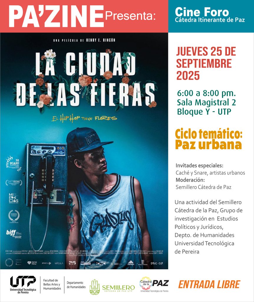 El Departamento de Humanidades de la Facultad de Bellas Artes y Humanidades, a través de la Cátedra de la Paz UTP y del Semillero de Cátedra de la Paz, invita la primera función del cineforo PA’ZINE de este semestre.