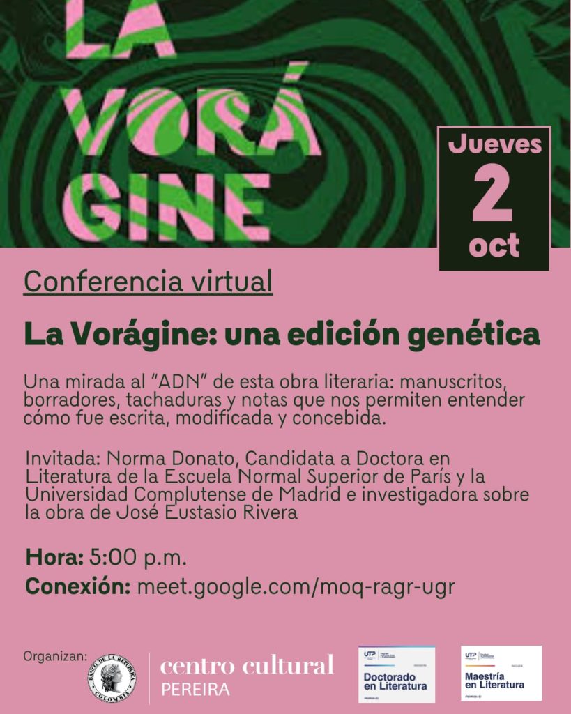 El Centro Cultural del Banco de la República de Pereira, la Maestría y el Doctorado en Literatura de nuestra universidad, invitan a la comunidad universitaria a participar este jueves 2 de octubre, en modo virtual, de la conferencia “La vorágine: una edición genética”, que ofrecerá la investigadora Norma Donato.