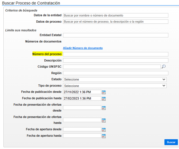 Para obtener mayor información sobre las convocatorias, pueden consultar el siguiente enlace: VER. Allí, se debe ingresar el número del proceso en el formulario de búsqueda, según se muestra en la siguiente imagen: