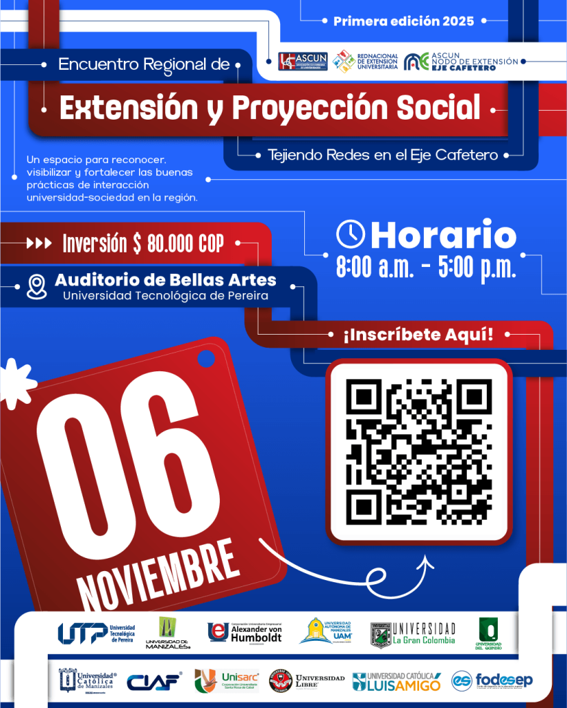 El evento se llevará a cabo el 6 de noviembre a partir de las 8:00 a. m. en el campus universitario, y contará con la participación de 11 universidades del Eje Cafetero que hacen parte del Nodo Regional de Extensión de ASCUN. Durante la jornada, se presentarán experiencias significativas y buenas prácticas que reflejan el compromiso de las instituciones de educación superior con la transformación social, el desarrollo territorial y la innovación desde la extensión universitaria.