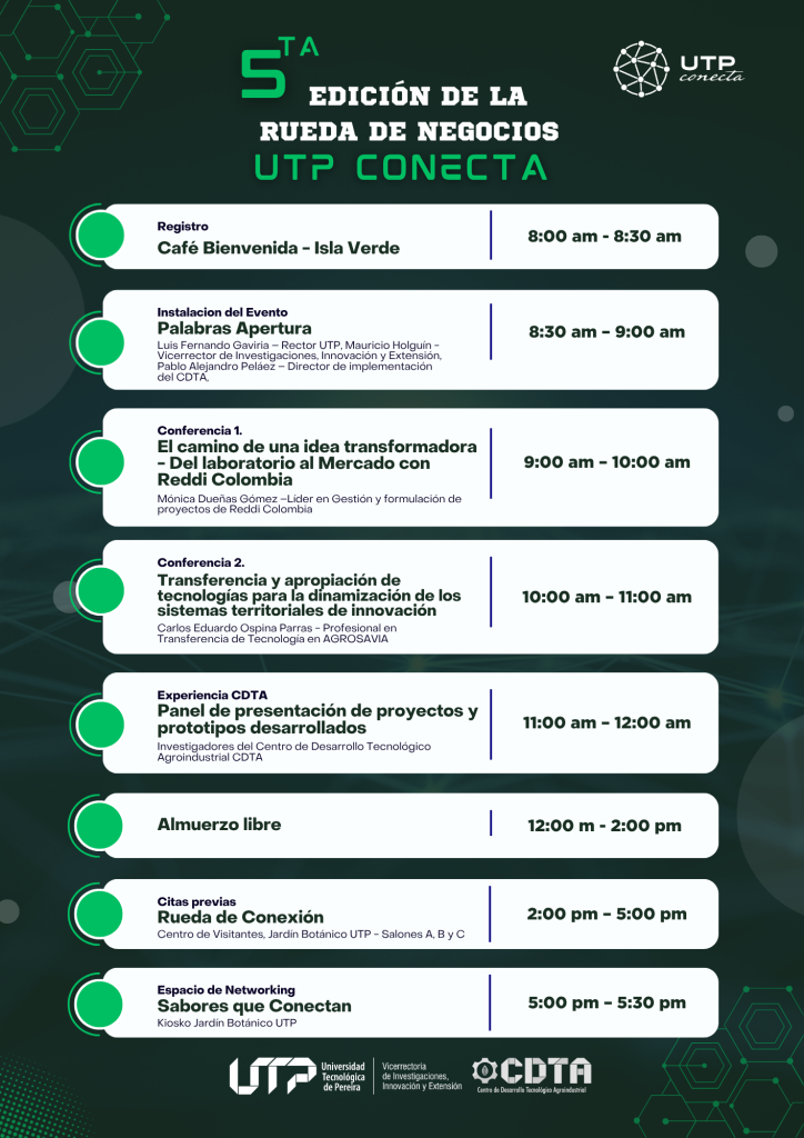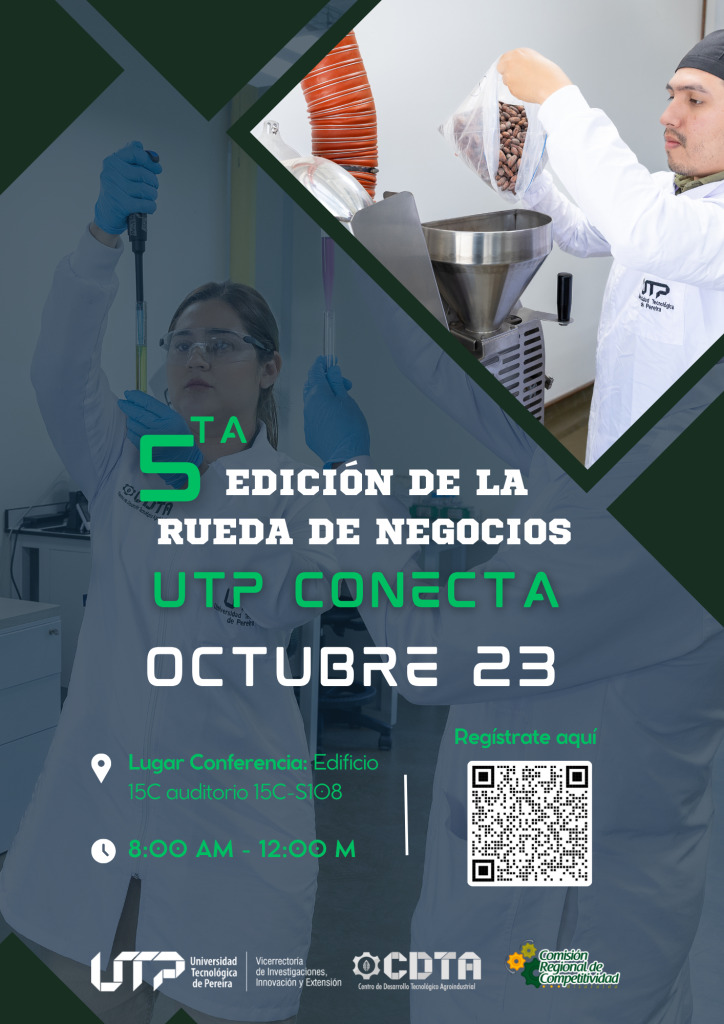 La Vicerrectoría de Investigaciones, Innovación y Extensión y el Centro de Desarrollo Tecnológico Agroindustrial CDTA, invita a toda la comunidad universitaria a participar en la 5ª edición de UTP Conecta, un espacio que promueve la articulación entre la academia, la empresa y el Estado para impulsar la transferencia tecnológica y la apropiación social del conocimiento.