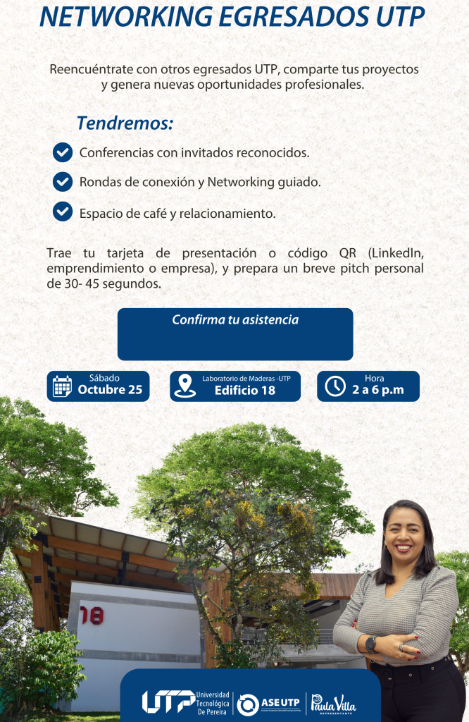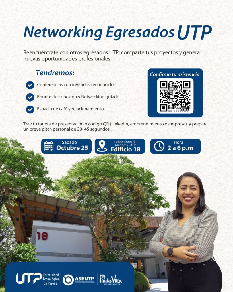La Asociación de Egresados de la Universidad Tecnológica de Pereira (ASEUTP) invita a toda la comunidad de egresados a participar en el Networking Egresados UTP, un encuentro promovido por la ingeniera Paula Andrea Villa Sánchez, representante de los egresados ante el Consejo Superior y gestora de este espacio de conexión profesional.
