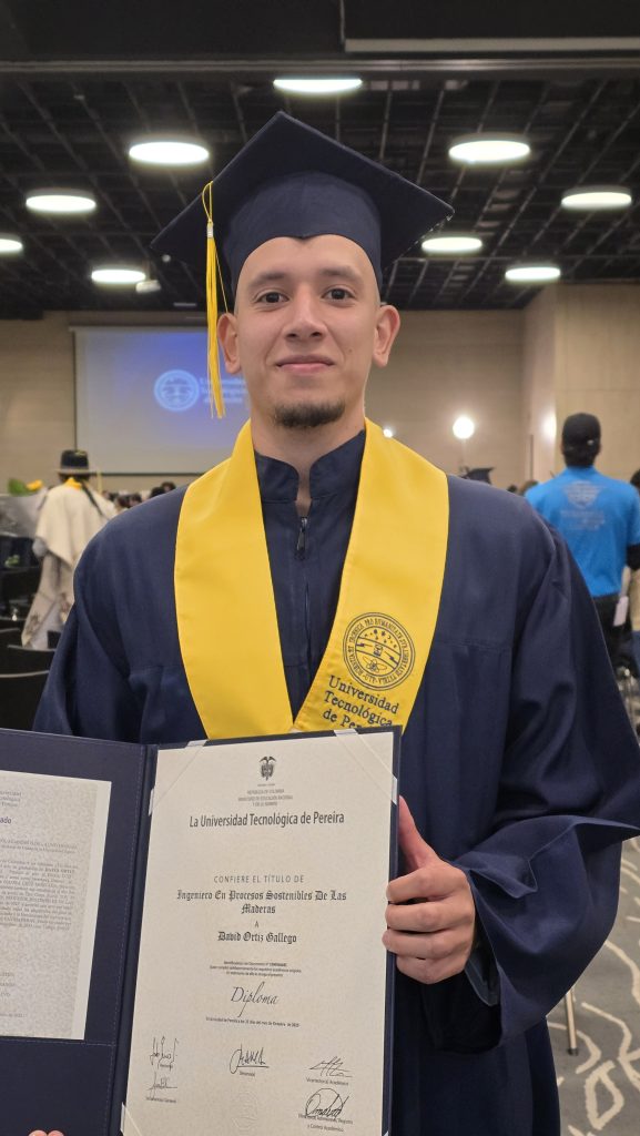 El programa de Ingeniería en Procesos Sostenibles de la Maderas, de la Facultad de Ciencias Agrarias y Agroindustria celebra la graduación de uno de sus estudiantes más comprometidos: David Ortiz Gallego, quien culmina su formación profesional tras seis años de esfuerzo, aprendizaje y superación personal.