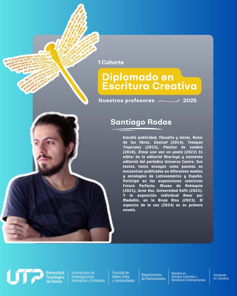 El próximo viernes 24 de octubre, el Diplomado en Escritura Creativa de la Universidad Tecnológica de Pereira ofrecerá una nueva lección magistral con la participación del escritor Santiago Rodas, una de las voces más provocadoras de la literatura colombiana contemporánea.