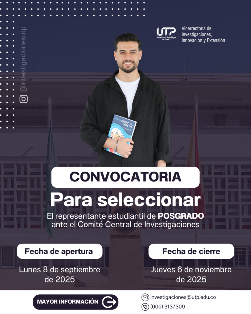 La Vicerrectoría de Investigaciones, Innovación y Extensión, invita a toda la comunidad universitaria a participar en la convocatoria pública para seleccionar el representante estudiantil de posgrado ante el comité central de investigaciones.