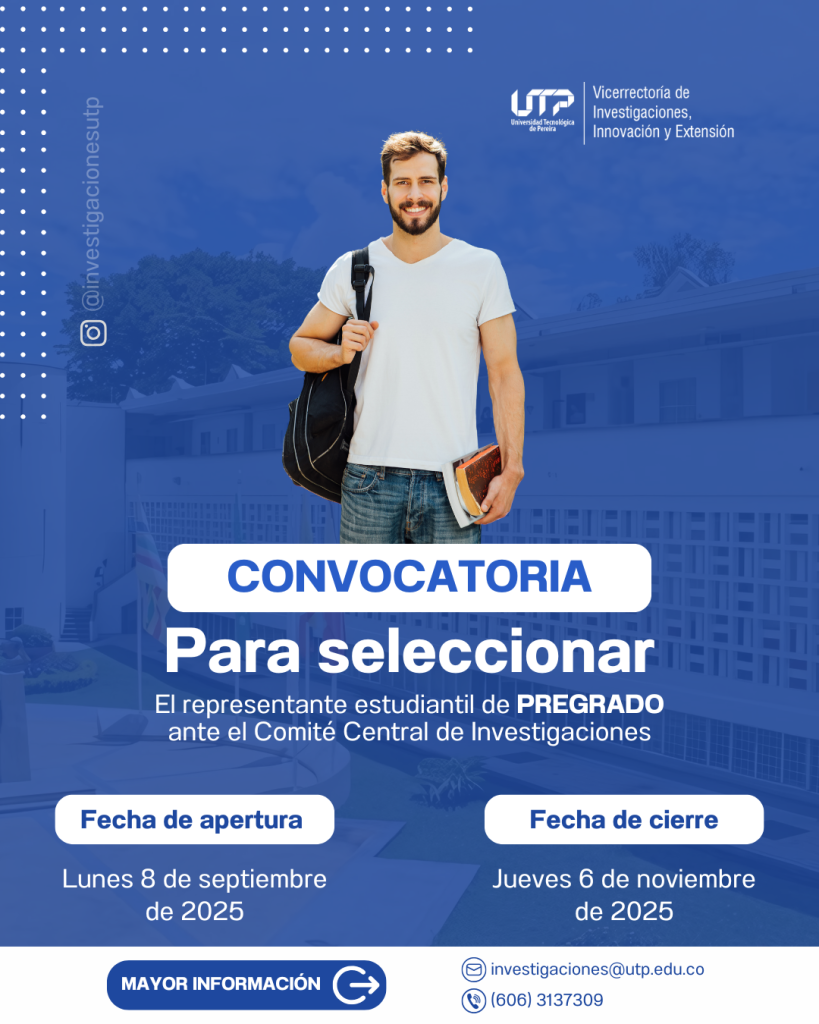 La Vicerrectoría de Investigaciones, Innovación y Extensión de la UTP, invita a toda la comunidad universitaria a participar en la convocatoria pública para seleccionar el representante estudiantil de pregrado ante el comité central de investigaciones.