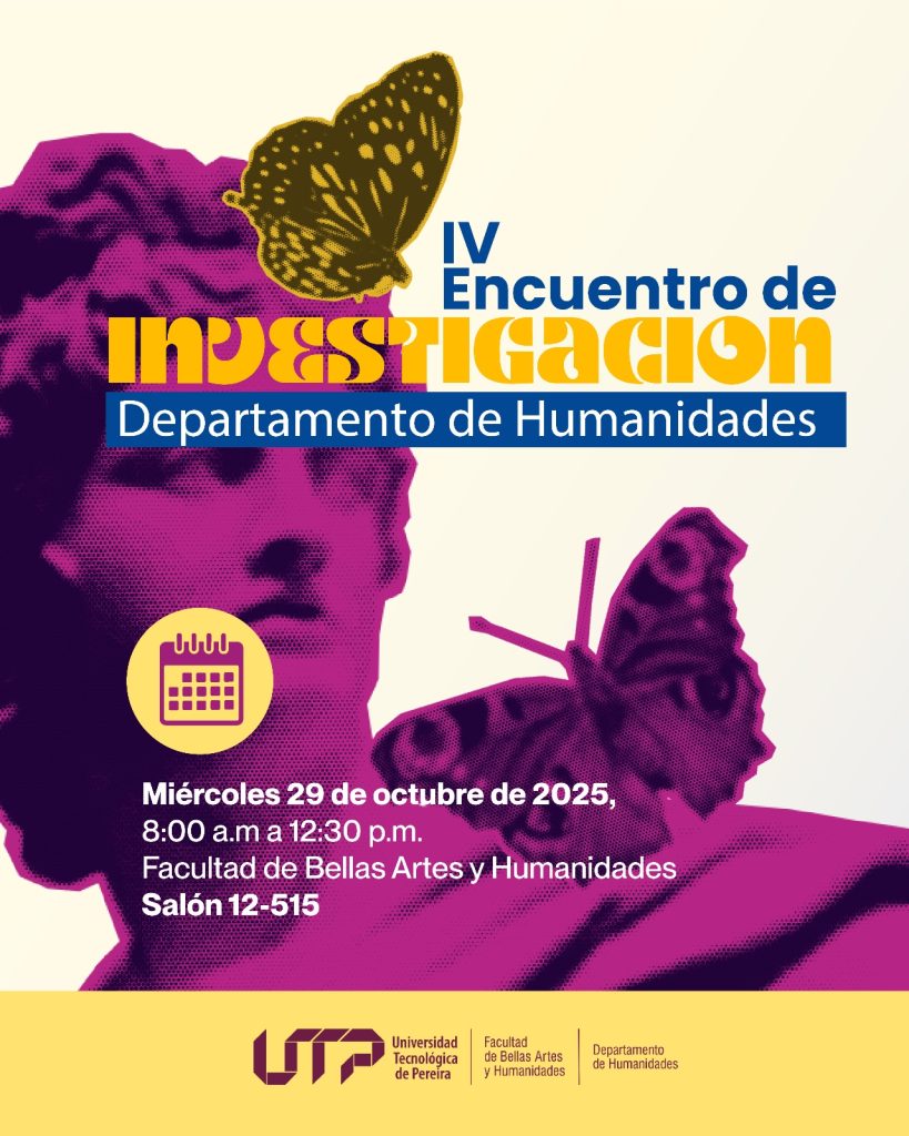 A lo largo de su trayectoria, el Departamento de Humanidades de la Facultad de Bellas Artes y Humanidades, de la Universidad Tecnológica de Pereira ha consolidado la investigación como un pilar fundamental de su quehacer académico. Lo anterior se refleja, entre otros aspectos, en el fortalecimiento de seis grupos de investigación, todos ellos categorizados por MinCiencias, un importante número de proyectos concluidos y otros en desarrollo, la participación constante de sus investigadores en convocatorias internas y externas de investigación, creación y extensión, la socialización de avances y resultados de los proyectos en eventos académicos en Colombia y fuera de ella, la publicación y circulación de producción académica y artística, y la interacción en diversos procesos culturales, artísticos y sociales de impacto local, nacional e internacional.