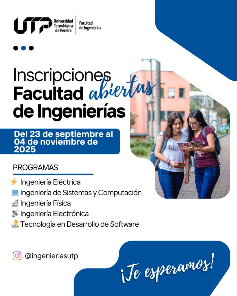 La Facultad de Ingenierías de la Universidad Tecnológica de Pereira anuncia la apertura oficial de inscripciones para sus programas de pregrado, una oportunidad para que jóvenes de todo el país den el primer paso hacia una carrera profesional en los campos más dinámicos y demandados del conocimiento.