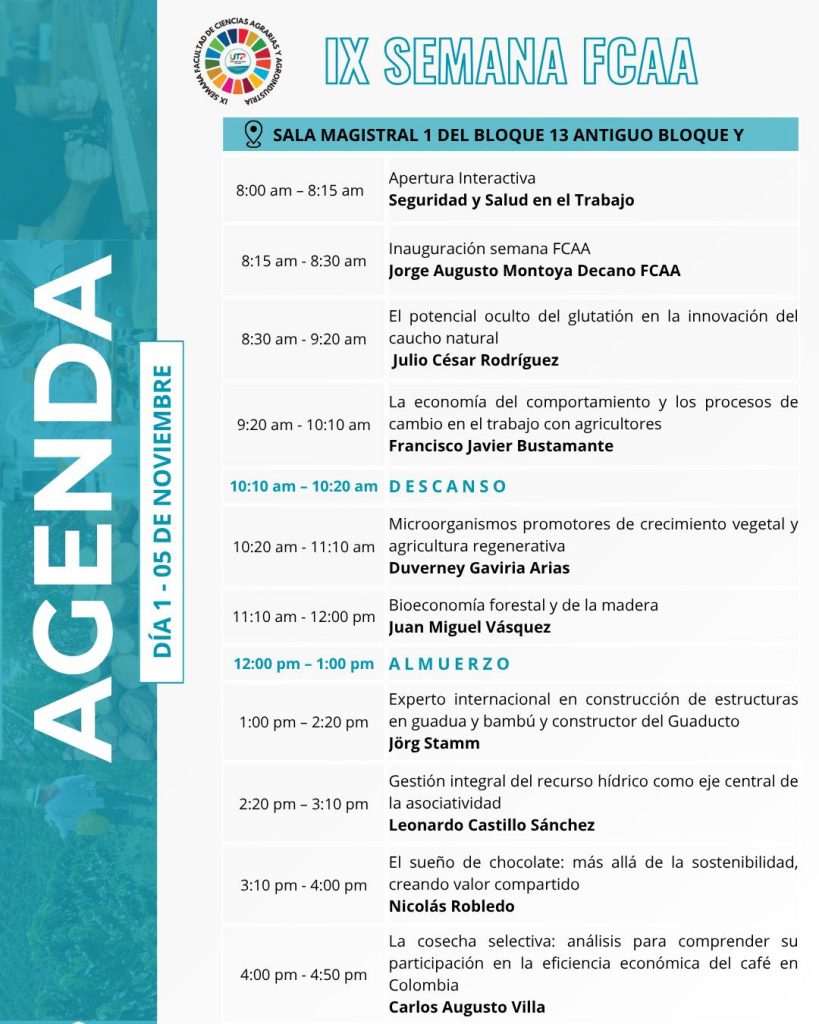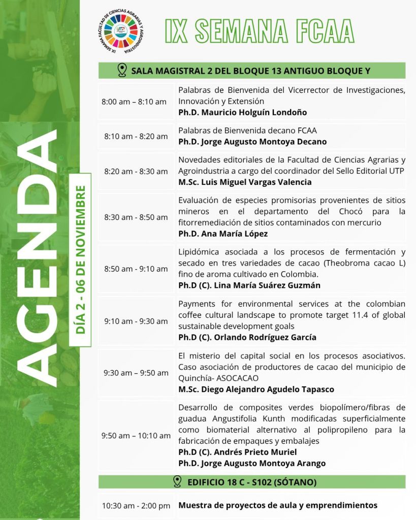 El segundo día estará dedicado a la ciencia aplicada, con ponencias sobre biopolímeros, cacao, bambú y servicios ambientales en el paisaje cafetero, además de una muestra de proyectos académicos y de emprendimiento en el Edificio 18C.