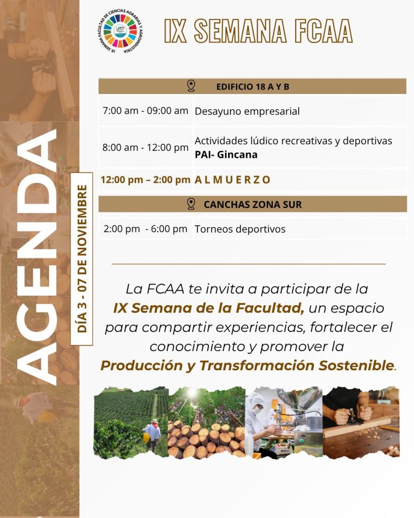 Del 5 al 7 de noviembre, la comunidad académica se reúne para vivir una agenda cargada de conocimiento, innovación y sostenibilidad bajo el lema Producción y Transformación Sostenible. Este encuentro, liderado por la FCAA, busca fortalecer los lazos entre la academia, la investigación y el sector productivo, promoviendo el desarrollo sostenible del campo y la agroindustria en la región.