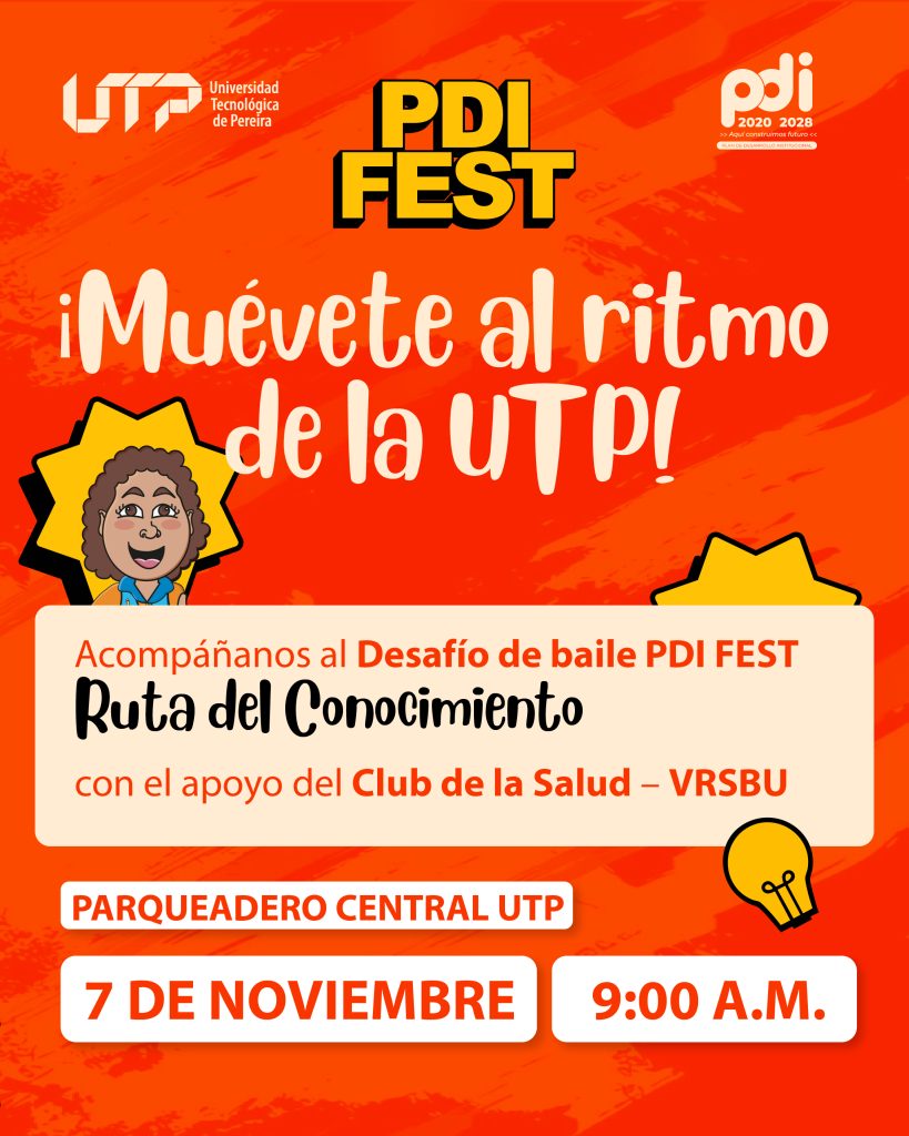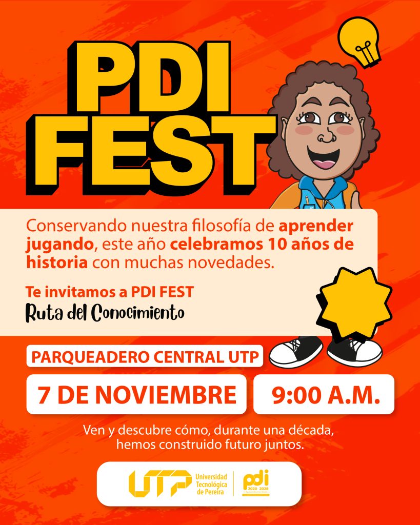 El próximo 7 de noviembre, de 9:00 a.m. a 12:00 m., el Parqueadero Central de la Universidad Tecnológica de Pereira será el punto de encuentro para vivir la décima edición del PDI Fest – Ruta del Conocimiento, una feria que celebra diez años de aprendizaje, gestión y transformación institucional.