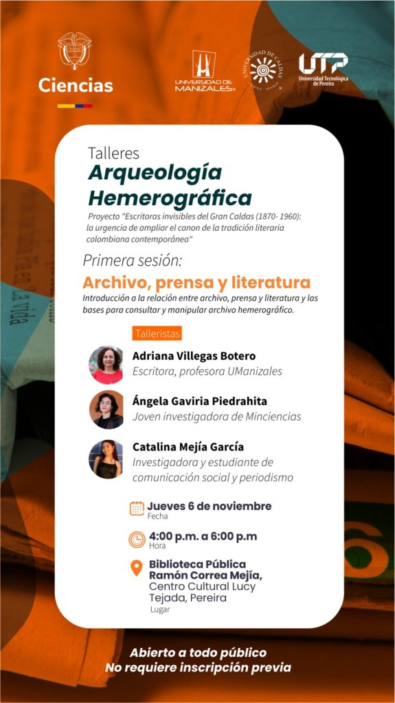 Los talleres se ofrecen como parte del proyecto «Escritoras invisibles del Gran Caldas (1870- 1960): la urgencia de ampliar el canon de la tradición literaria colombiana contemporánea», apoyado por MinCiencias, la Universidad Tecnológica de Pereira, la Universidad de Manizales y la Universidad de Caldas.