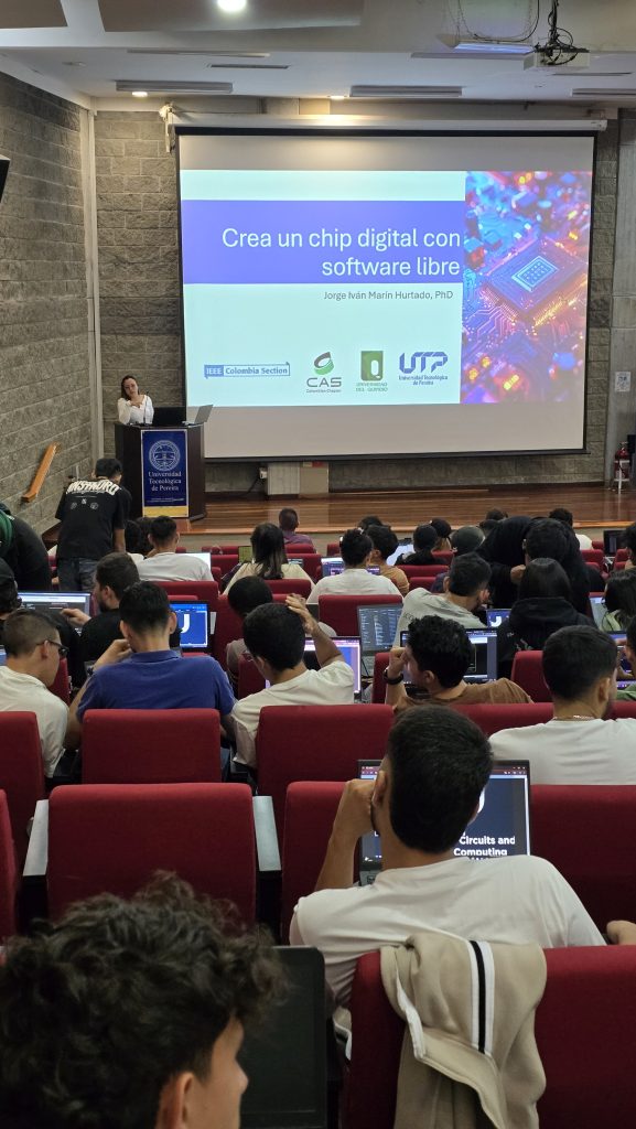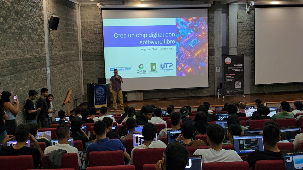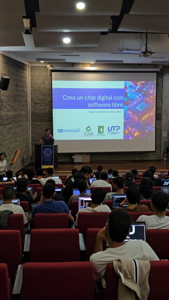 El espacio, titulado “Semiconductores: crea un chip digital con software libre”, estuvo a cargo del doctor Jorge Iván Marín, docente de la Universidad del Quindío y miembro activo de la IEEE-CAS (Circuits and Systems Society). Bajo su orientación, los participantes tuvieron la oportunidad de crear un chip digital desde cero utilizando herramientas de software libre, adentrándose en las tecnologías CMOS, los diagramas de stick, las celdas estándar y el flujo completo de diseño con OpenLane, una plataforma que permite obtener un layout final listo para fabricación.