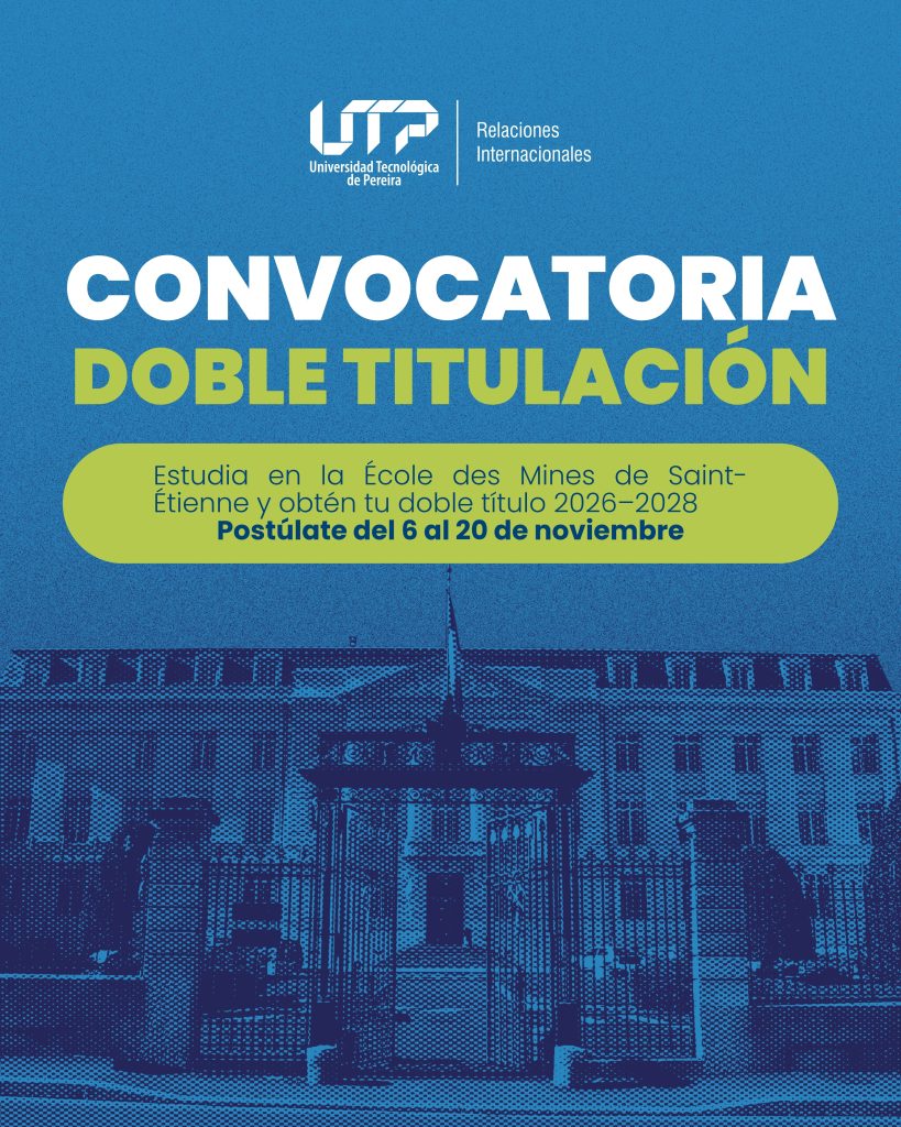 La Oficina de Relaciones Internacionales (ORI) invita a los estudiantes de ingeniería de la Universidad Tecnológica de Pereira a participar en la Convocatoria del Programa de Doble Titulación 2026–2028 con la École nationale supérieure des mines de Saint-Étienne (Francia).