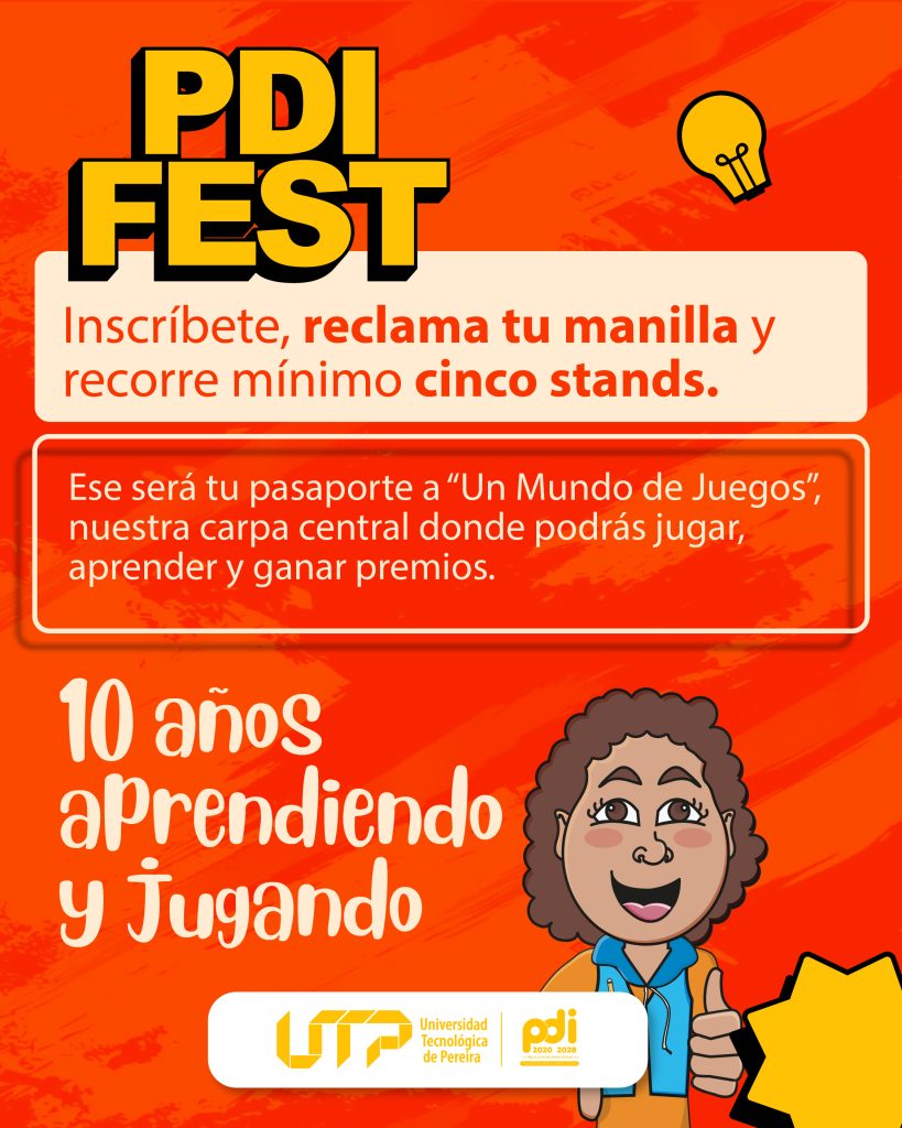 Y prepárate, llega con ropa cómoda por la PDI FEST, arranca con Muévete al Ritmo del PDI con Rumba, un instructor te guiará al mejor ritmo de la Música y no te regreses temprano porque también estará con nosotros el Conjunto Vallenato de la UTP, para cerrar con broche de oro estos  ¡10 años aprendiendo y jugando!