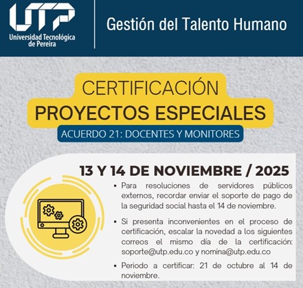 El proceso de Administración de la Compensación recuerda que los días JUEVES 13 y VIERNES 14 de noviembre del 2025, son las fechas asignadas para realizar la Certificación y Aprobación de docentes, administrativos y monitores de Proyectos Especiales (Acuerdo 21) – Periodo a certificar desde el 21 de octubre hasta el 14 de noviembre del 2025 según su correcta ejecución.