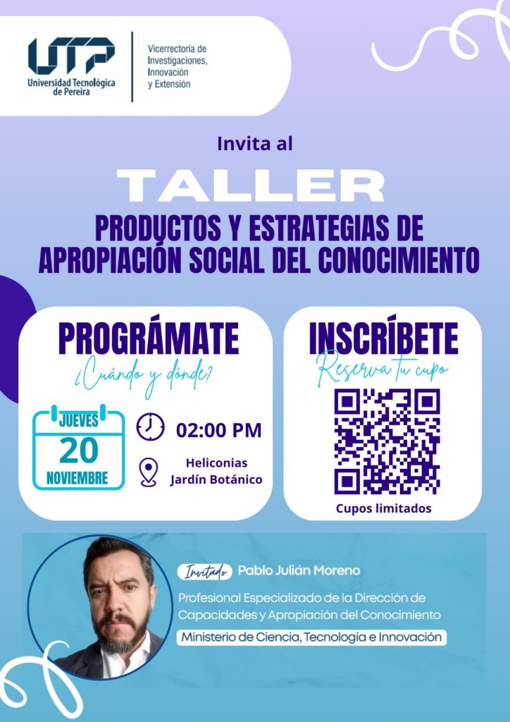 El taller contará con la participación de Pablo Julián Moreno, profesional especializado del Ministerio de Ciencia, Tecnología e Innovación, quien compartirá su experiencia en estrategias que promueven el intercambio de saberes entre la académica y la sociedad.