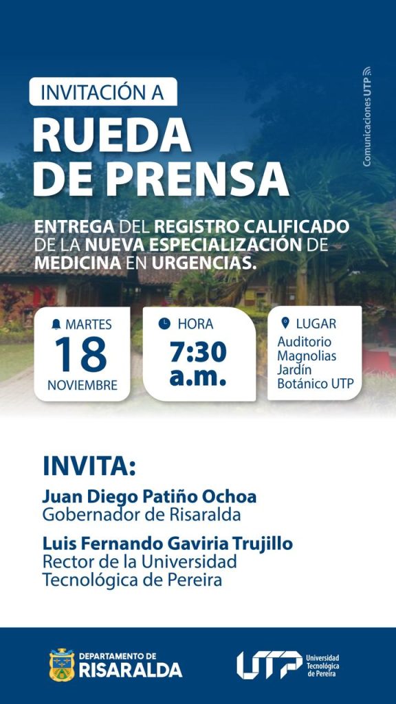 El gobernador de Risaralda, Juan Diego Patiño Ochoa y el rector de la UTP, Luis Fernando Gaviria Trujillo, invitan al lanzamiento oficial de la nueva Especialización en Medicina de Urgencias.