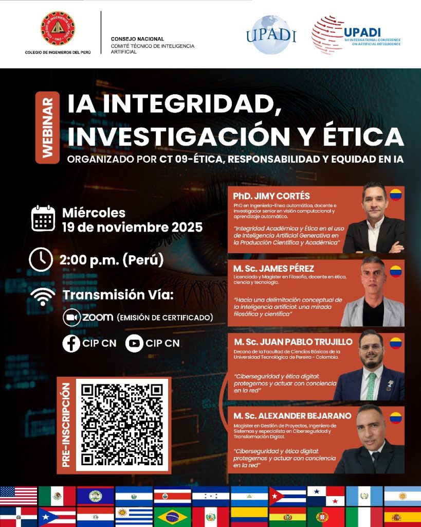 “Queremos invitarlos al webinar Integridad, investigación y ética, donde vamos a estar cuatro docentes aquí en la Universidad Tecnológica de Pereira el próximo miércoles 19 de noviembre a las 2 de la tarde. Este es un evento precongreso del Congreso Internacional de Inteligencia Artificial que se llevará a cabo en Perú en agosto del próximo año, organizado por UPADI, la Unión Panamericana de Asociaciones de Ingenieros. Cordialmente invitados”, señaló.