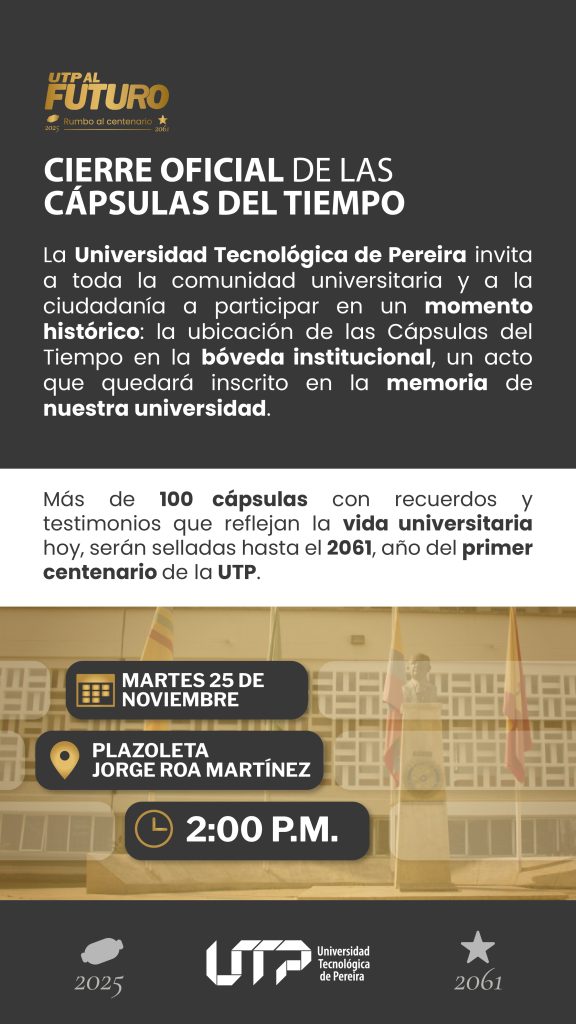 En un acto cargado de simbolismo, memoria y visión de futuro, la Universidad Tecnológica de Pereira se prepara para vivir uno de los momentos más significativos de su historia reciente: el cierre oficial de las cápsulas del tiempo. Este evento tendrá lugar el martes 25 de noviembre a las 2:00 p.m. en la Plazoleta Jorge Roa Martínez, convoca a toda la comunidad universitaria y al público en general a ser testigos de un gesto que trasciende generaciones.