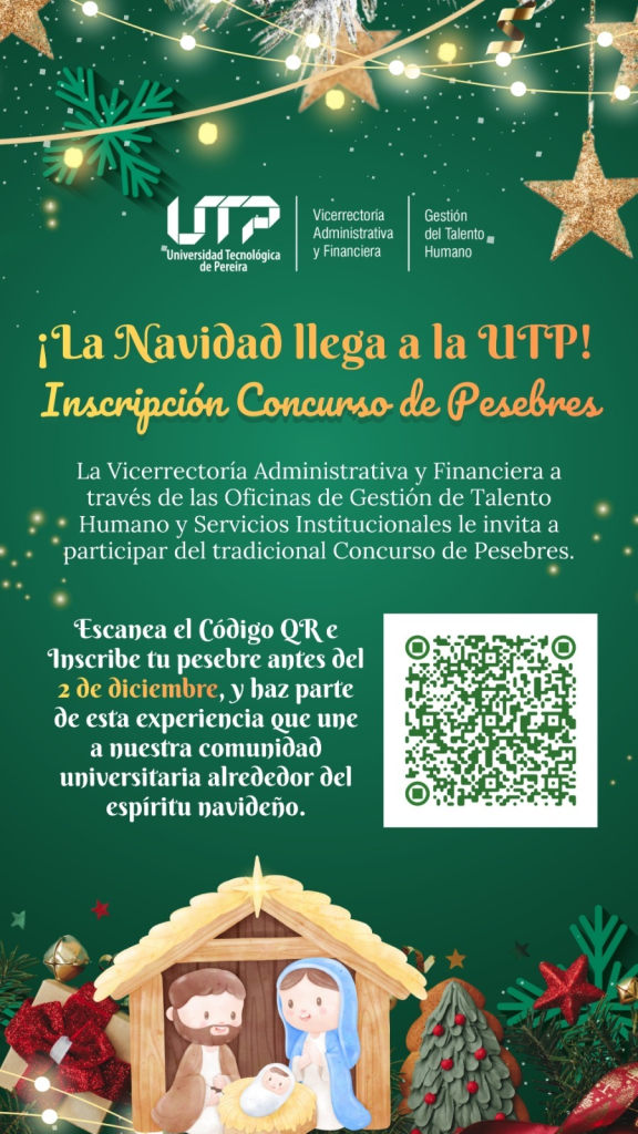 La Universidad Tecnológica de Pereira, invita a la Comunidad Universitaria a participar en el Tradicional Concurso de Pesebres cuyo propósito es promover el espíritu navideño, la expresión artística y la integración de la comunidad universitaria en torno a nuestras tradiciones, a través de la creación de pesebres que expresen creatividad y sentido simbólico.