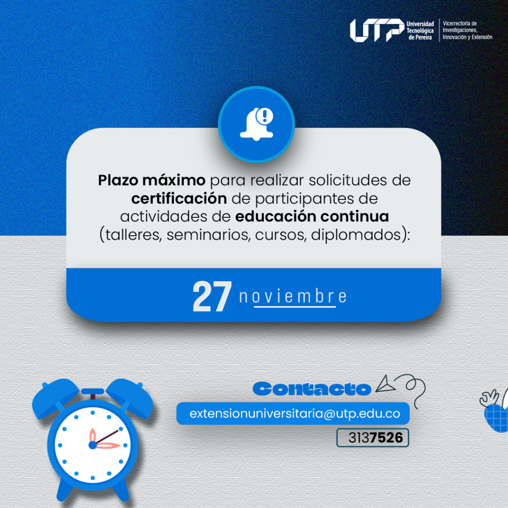 La Vicerrectoría de Investigaciones, Innovación y Extensión, en conjunto con la Oficina de Admisiones, Registro y Control Académico, informa a los docentes responsables de actividades de educación continua que, con el propósito de garantizar una atención oportuna y eficiente en la generación de certificaciones para los participantes, se establecieron fechas clave para la recepción y trámite de estas solicitudes.