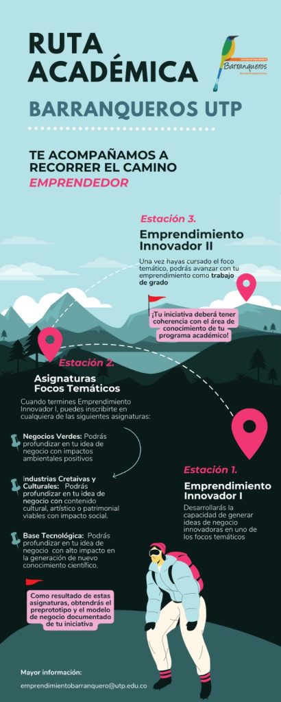 Los estudiantes interesados pueden encontrar estas asignaturas dentro del listado de optativas de sus programas académicos. Pueden llenar el siguiente formulario https://forms.gle/2boL2kmzJ6RG7TDN9 o pueden escribir al correo emprendimientobarranquero@utp.edu.co donde recibirán información y acompañamiento por parte del equipo del ecosistema.