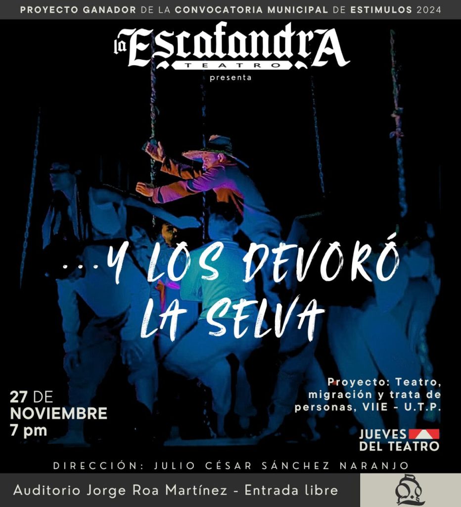 Este jueves 27 de noviembre, La Escafandra Teatro presenta su obra  «…Y LOS DEVORÓ LA SELVA», en el marco de los Jueves del Teatro en la UTP, apoyado por la VRSBU y del proyecto TEATRO, MIGRACIONES FORZADAS Y TRATA DE PERSONAS, apoyado por la VIIE.