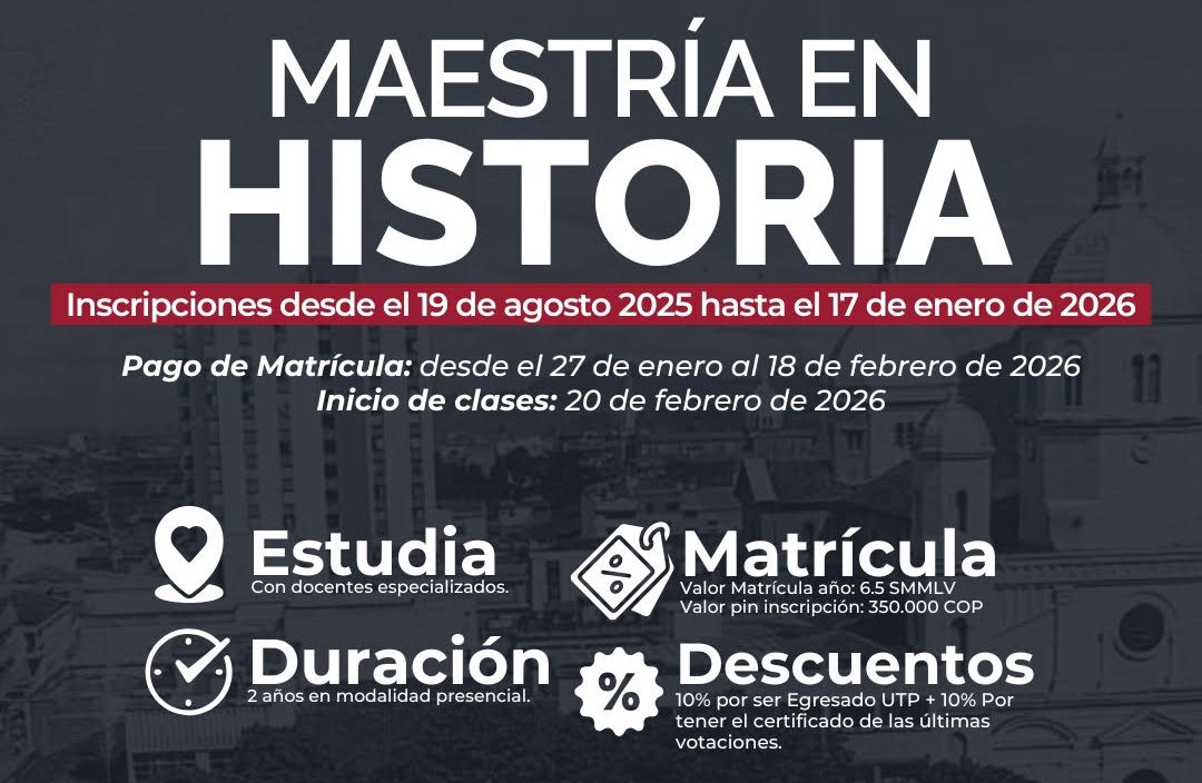 Desde la Universidad Tecnológica de Pereira y la Maestría en Historia, nos complace invitarles muy especialmente a un encuentro presencial en el que presentaremos los aspectos más relevantes del programa: sus líneas de investigación, oportunidades académicas, beneficios institucionales y el proceso de inscripción para el semestre 2026-1 en la XV COHORTE.