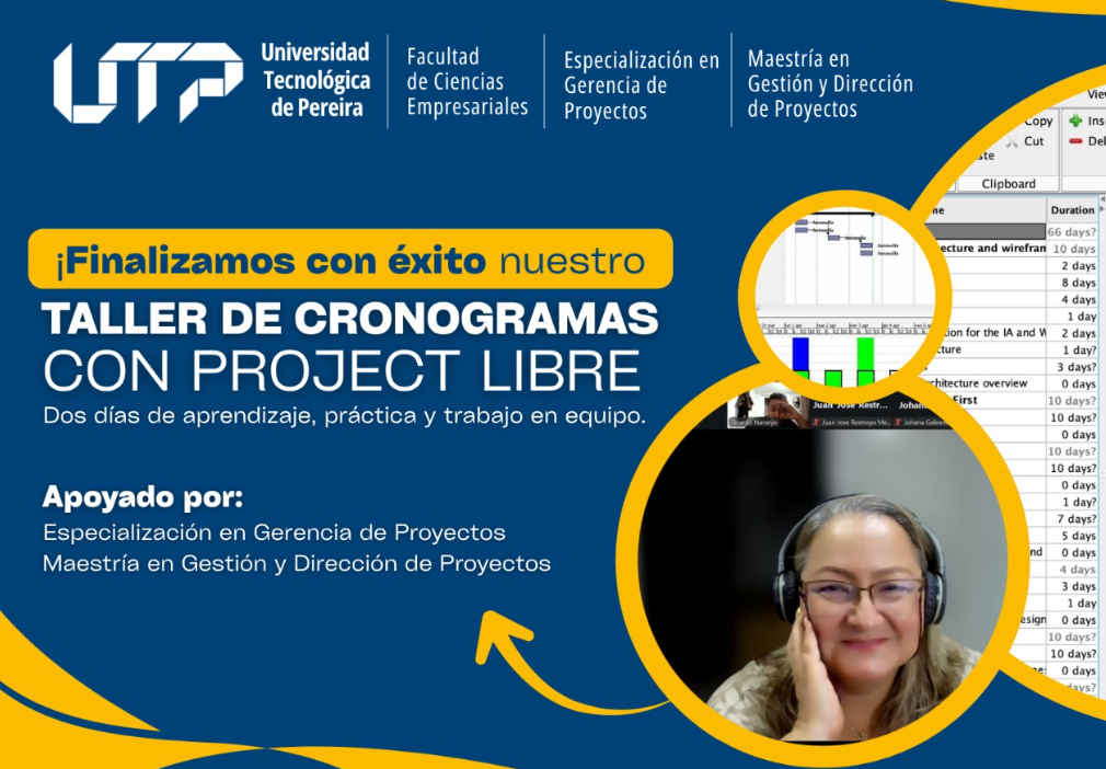 «El pasado 10 y 17 de octubre, la Facultad de Ciencias Empresariales de la Universidad Tecnológica de Pereira desarrolló con éxito el Taller de Cronogramas con Project Libre, un espacio formativo de 8 horas con certificación, apoyado por la Especialización en Gerencia de Proyectos y la Maestría en Gestión y Dirección de Proyectos.