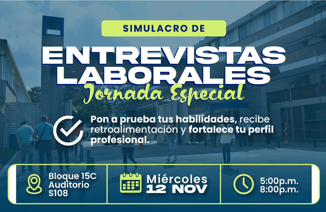 La Vicerrectoría de Investigaciones, Innovación y Extensión a través la Oficina de Prácticas, en alianza con la Bolsa de Empleo UTP, invita a los estudiantes de programas en jornada especial y nocturna a participar en el Simulacro de Entrevistas Laborales, un espacio diseñado para fortalecer habilidades comunicativas y preparar a los futuros profesionales para sus procesos de selección.