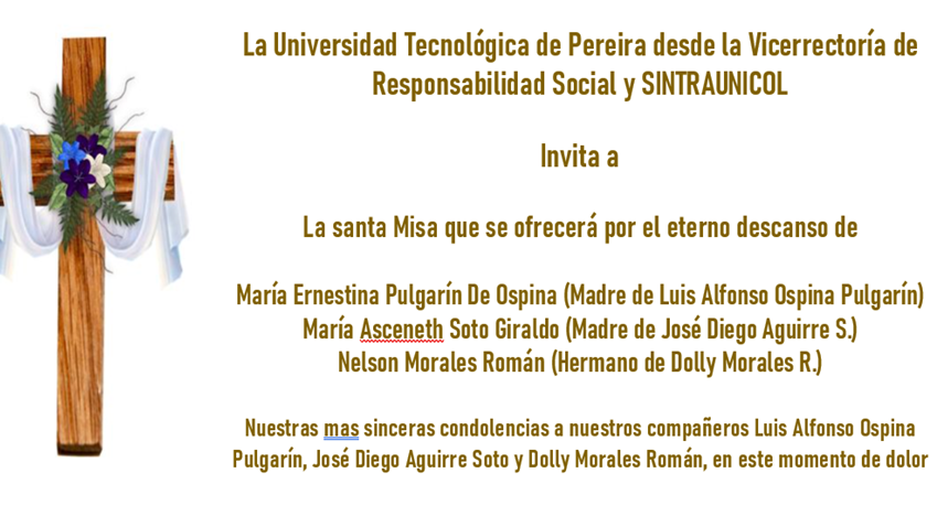 La Universidad Tecnológica de Pereira, invita a la Santa Misa que se llevará a cabo este viernes 31 de octubre en acompañamiento a nuestro compañero de la Vicerrectoría de Responsabilidad social y Bienestar Universitario, Luis Alfonso Ospina, y a dos compañeros más de la Universidad, José Diego Aguirre Soto y Dolly Morales R. que han perdido en estos […]